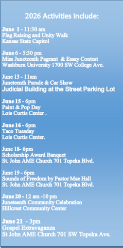 Our community has inspired generations. Here, we flourish and thrive with our community's support of the Topeka Juneteenth Celebration, Inc. We're home to famous people, great history, wonderful atmosphere to raise our children. Come, join us as we celebrate our heritage and be inspired!